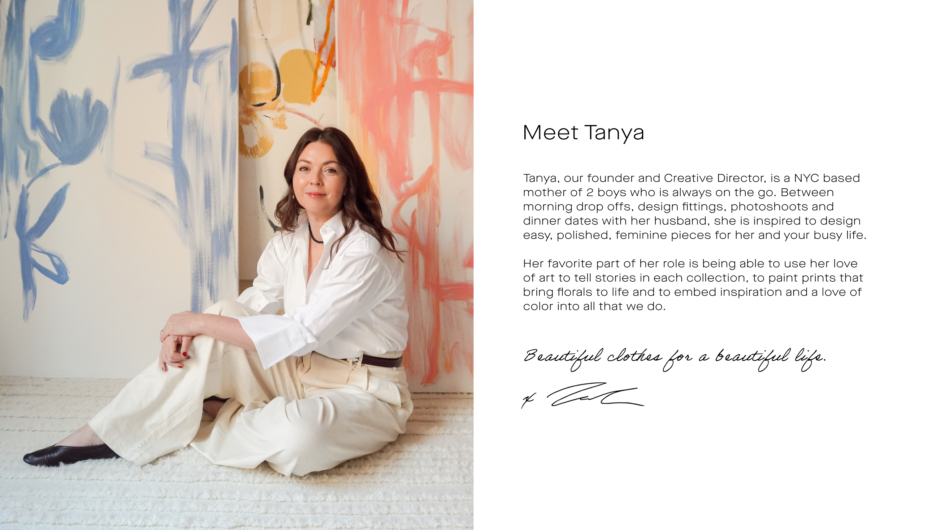 Tanya, our founder and Creative Director, is a NYC based mother of 2 boys who is always on the go. Between morning drop offs, design fittings, photoshoots, and dinner dates with her husband she is inspired to design easy, polished, feminine pieces for her and your busy life.
