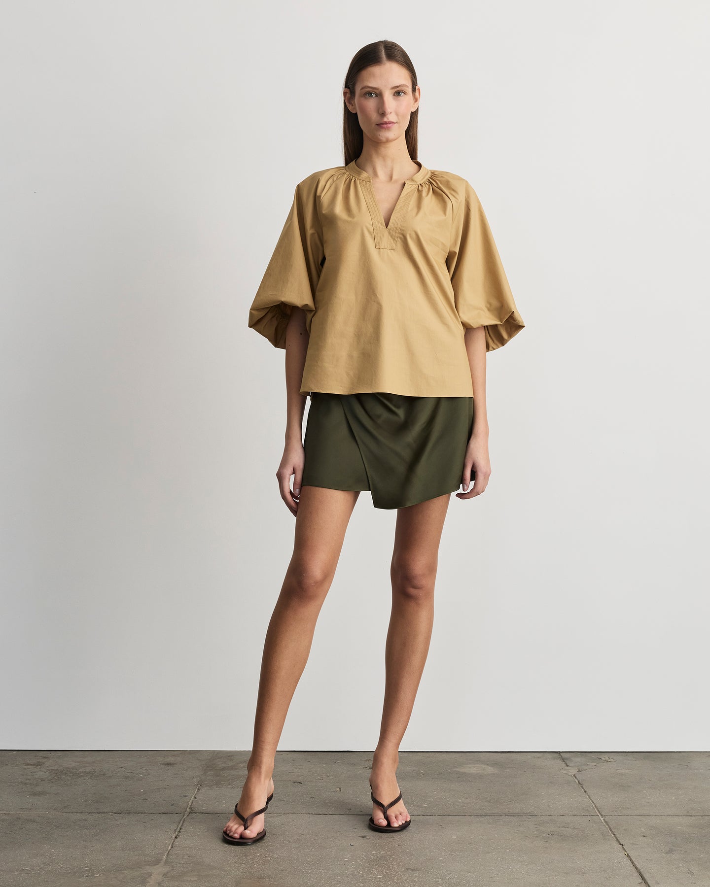 Featuring 3/4 length balloon sleeves offset by the straight cut of the shirt, the Marine Top is an easy silhouette with a casual sophistication.