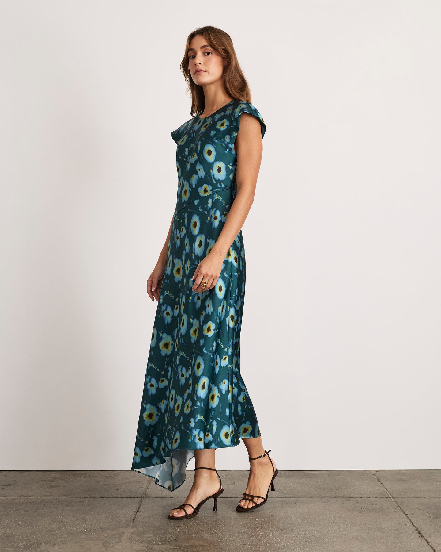 Crafted from a luxe satin crepe, this timeless silhouette features a romantic crew neckline with flutter sleeves and a graceful bias cut into an asymmetrical hem that flatters effortlessly.