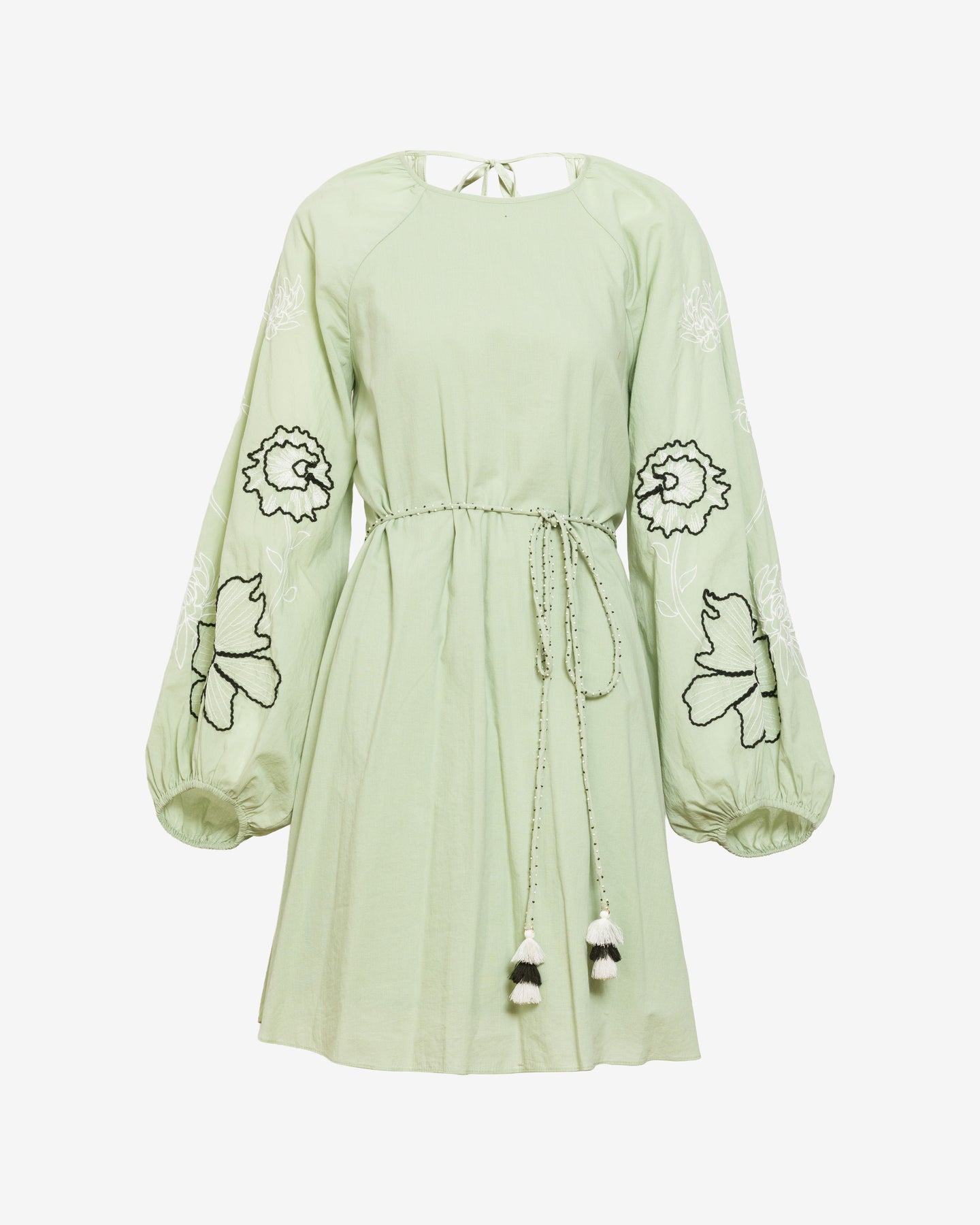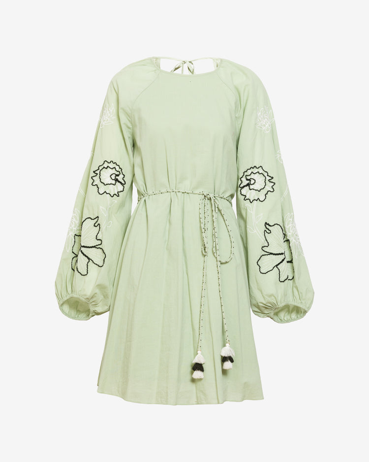 Designed on a cotton voile base with chrysanthemum embroidered sleeves, the Tay Dress is a feminine coverup with versatility of wear.