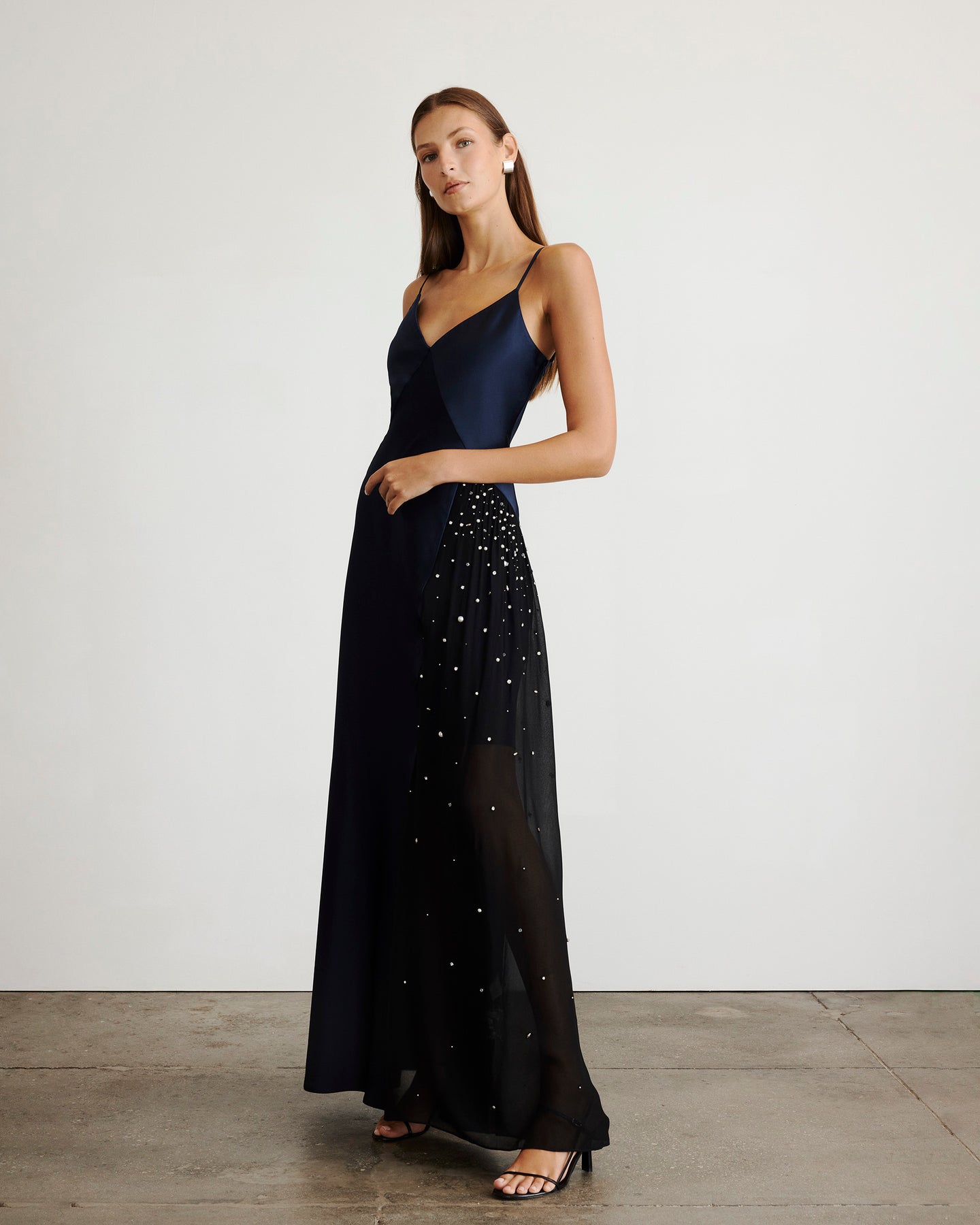 Crafted from a luxe satin crepe, this timeless silhouette features a romantic v-neckline, a one-of-a-kind crystal embellished poly chiffon side skirt cutout and a graceful bias cut silhouette that flatters effortlessly.