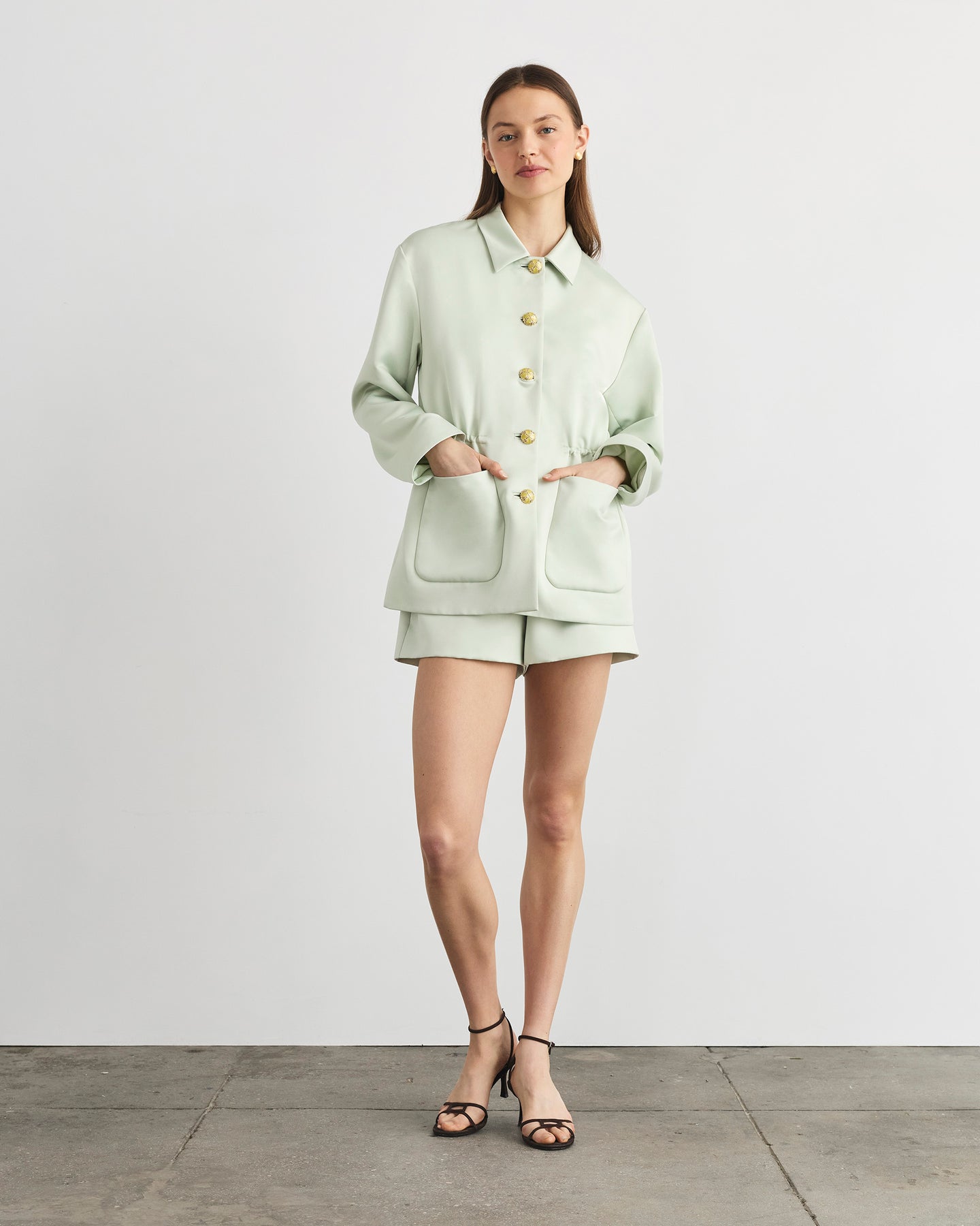 Designed in a luxe satin and featuring custom gold front buttons, an adjustable corded cinched waist, and collared neckline, Conrad is the perfect plus one to any event look this spring.
