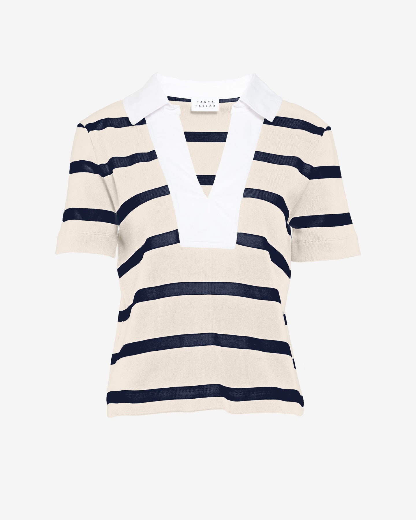 Designed in an organic rugby stripe and featuring a contrasting v-neck and collar, Melanie adds a playful polish to any look.