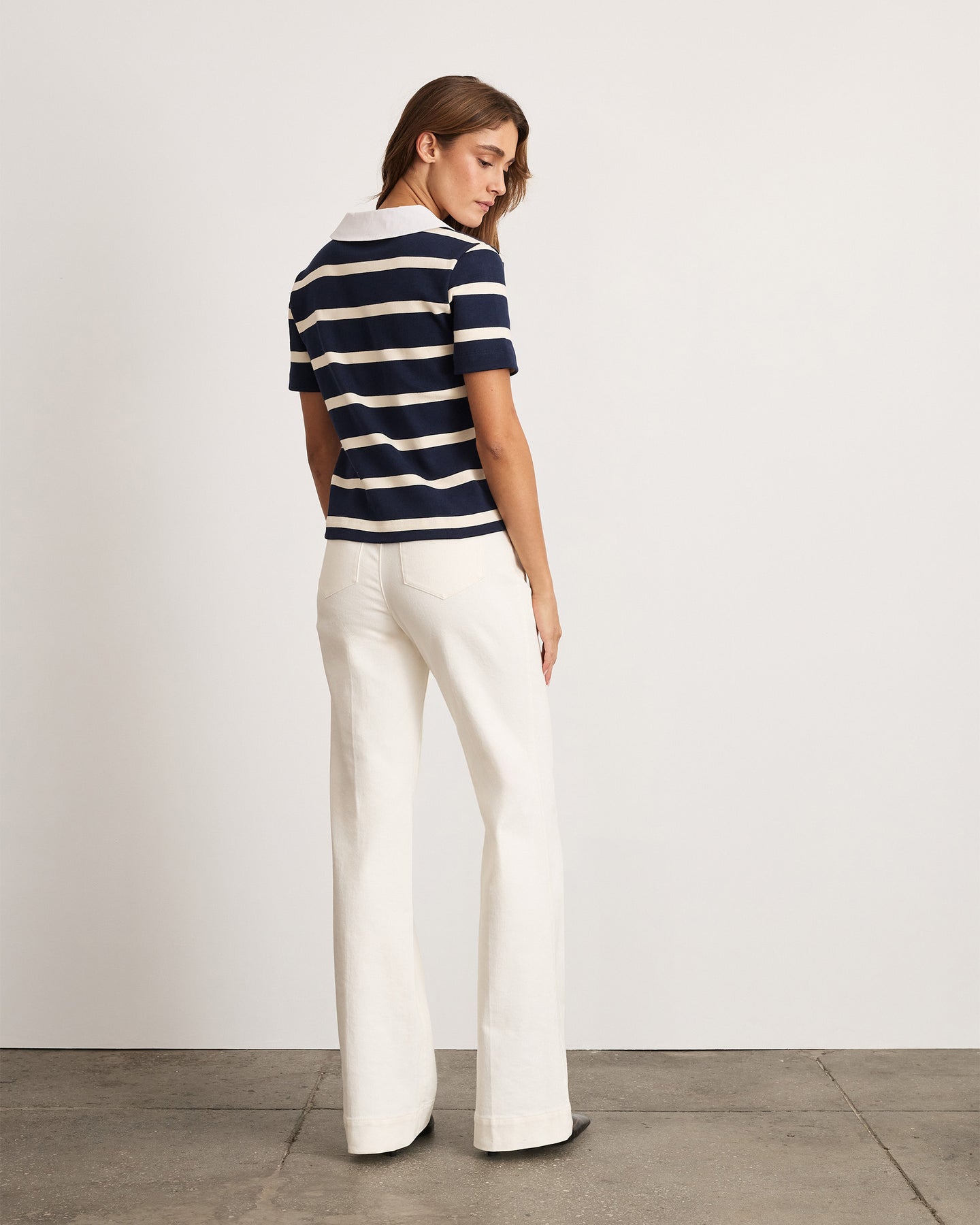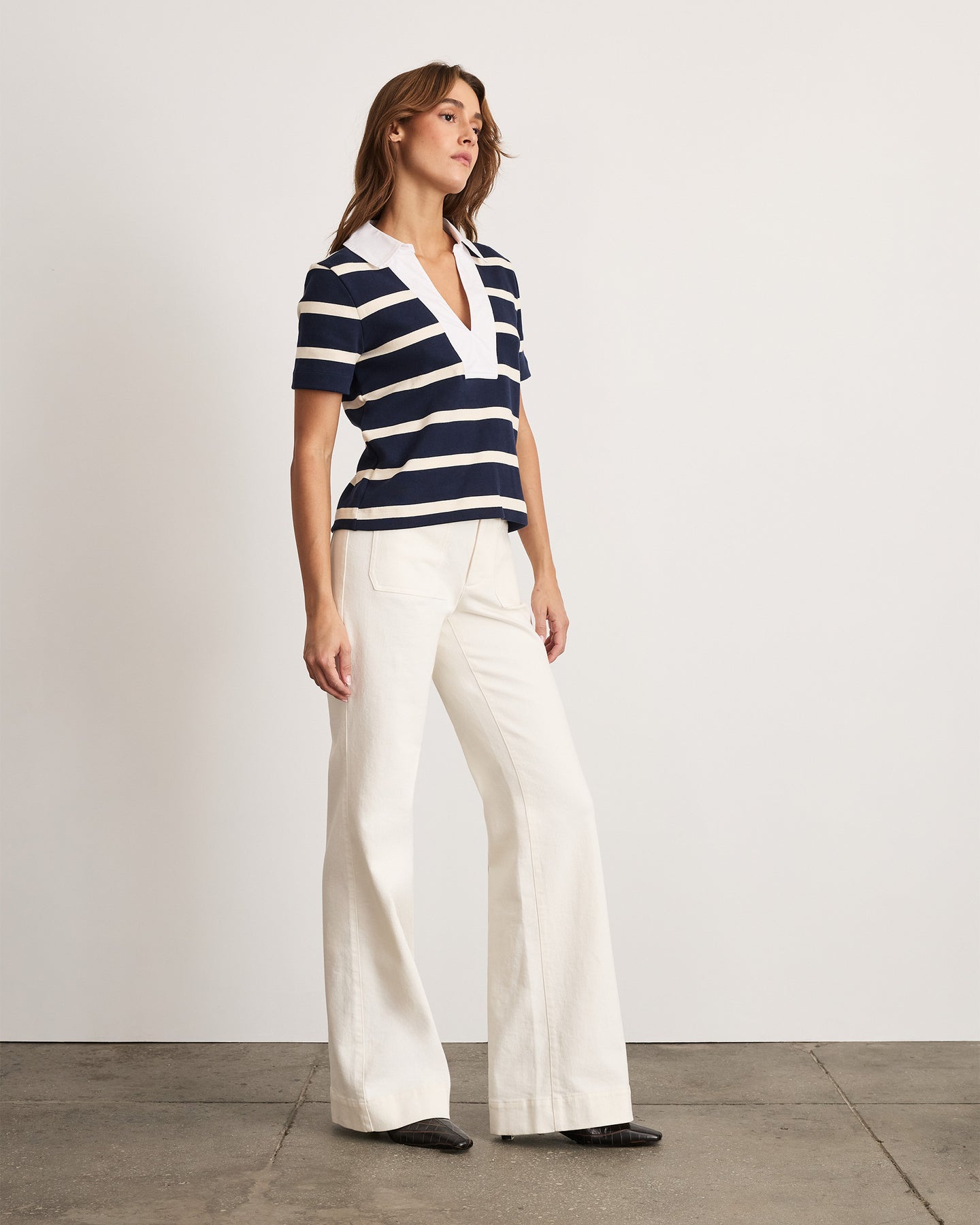 Designed in an organic rugby stripe and featuring a contrasting v-neck and collar, Melanie adds a playful polish to any look.