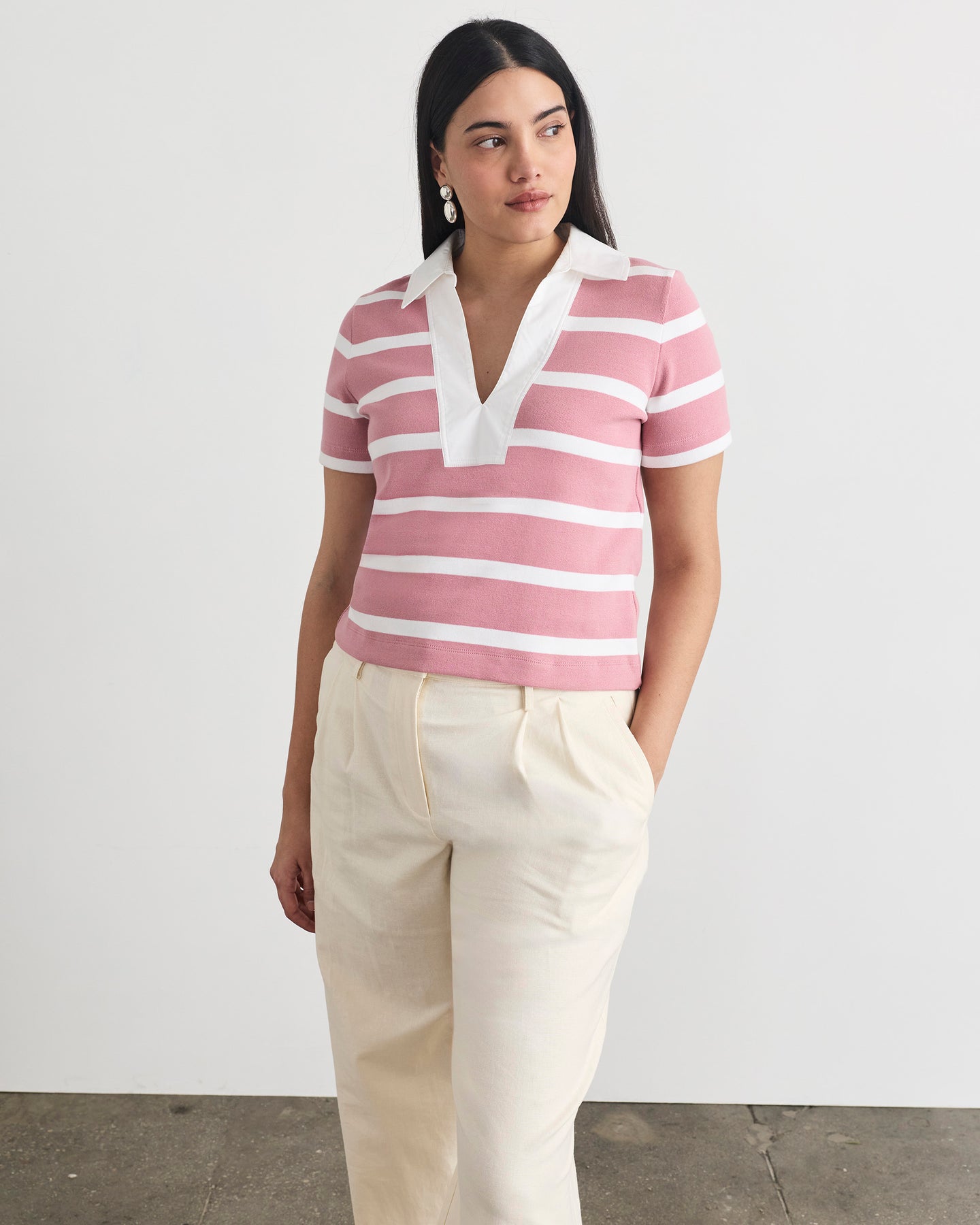 Designed in an organic rugby stripe and featuring a contrasting v-neck and collar, Melanie adds a playful polish to any look.